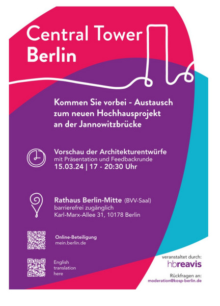 Der Baustadtrat des Bezirks Berlin-Mitte, Ephraim Gothe, und die HB Reavis Germany Gmbh laden die Anwohner zur Folgeveranstaltung, der am 27.02.2024 stattgefundenen Informationsveranstaltung zum geplanten Hochhausprojekt, ein.