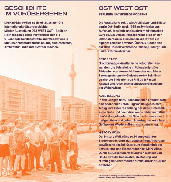 Die Ausstellung informiert über den Wiederaufbau Berlins nach 1945 in Ost und West am Beispiel der Karl-Marx-Allee. Anschaulich wird die Planung, der Bau und der Alltag der Karl-Marx-Allee in einem Digital History Walk vorgestellt. An den U-Bahneingängen verweisen QR-Codes auf die Geschichte von 24 Bauten zwischen Alexanderplatz und Frankfurter Tor.