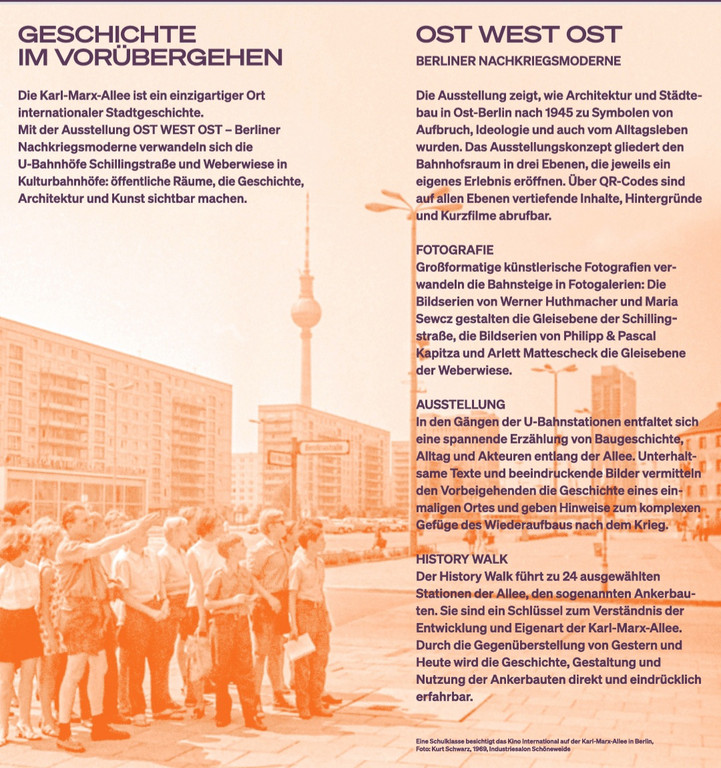 Ab 22. Oktober 2025 ist auf der U-Bahnlinie der U5 in den Bahnhöfen Schillingstraße und Weberwiese die neue -Dauerausstellung „OST WEST OST - Berliner Nachkriegsmoderne“ zu sehen. Das Projekt der Kulturbahnhöfe wurde vom Landesdenkmalamt Berlin initiiert in Zusammenarbeit mit den gemeinnützigen Vereinen vor Ort.