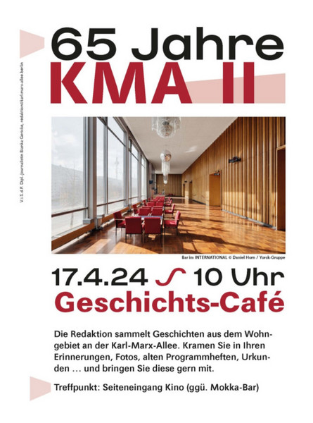 Am 6. Oktober 1959 erfolgte mit dem Wohnblock 53 die Grundsteinlegung für den zweiten Bauabschnitt der Karl-Marx-Allee. Anlässlich des diesjährigen 65-jährigen Jubiläums lädt die Redaktion des KMA-Magazins die Anwohner des Wohngebiets zu einem Geschichts-Café in die Panorama Bar des Kinos „International“ ein.